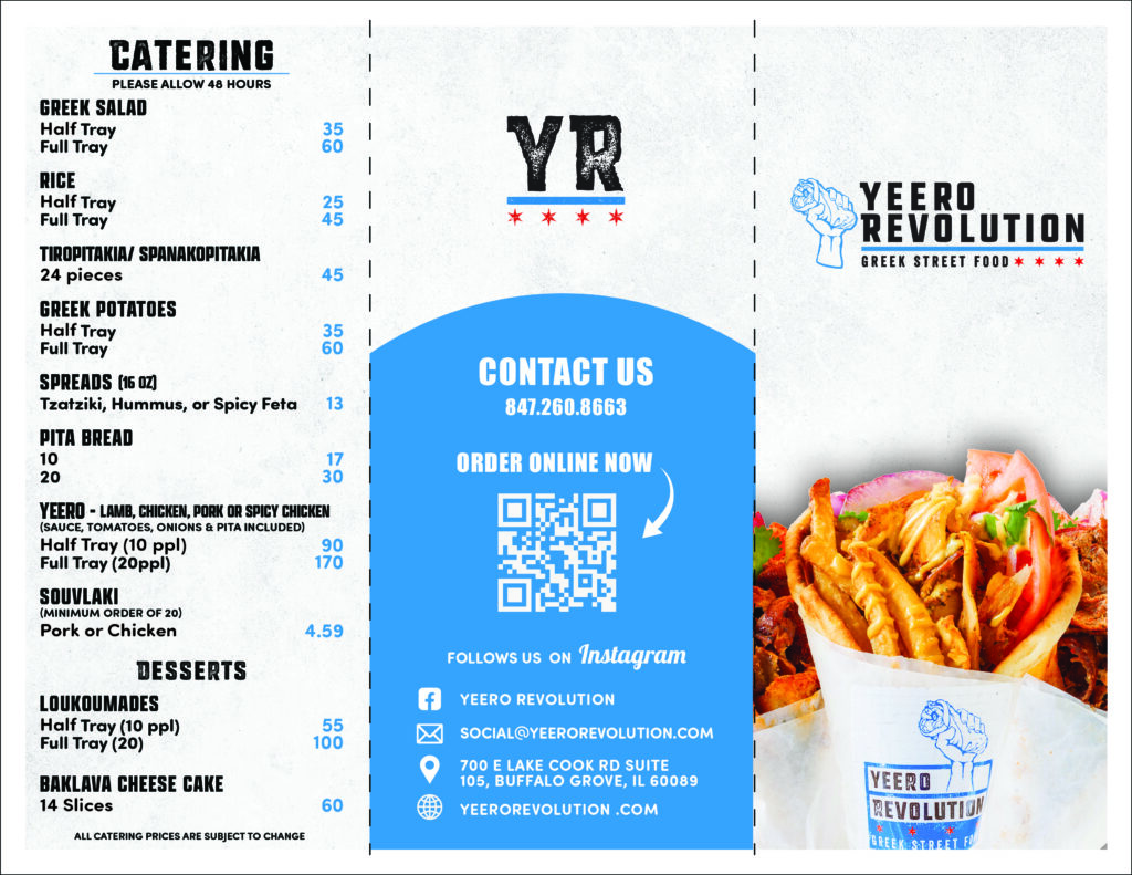 Take a closer look Yeero Revolution “Chipotle but Greek Style” Reopening a Greek fast food restaurant. Posters + flyers Screen menus Trifold Carry-out menu Apparel for Optimal user experience and evaluation please visit my portfolio on a bigger monitor back